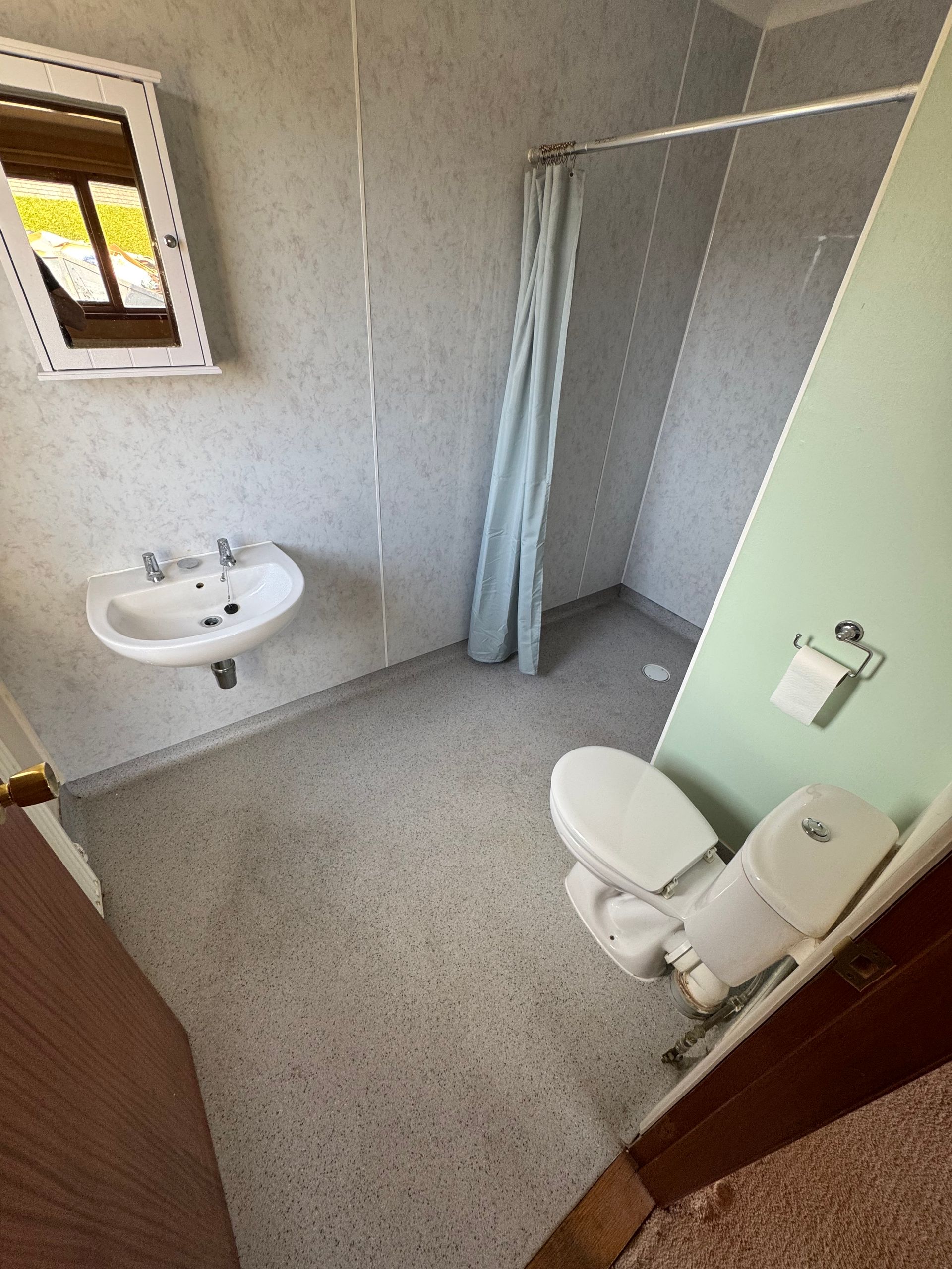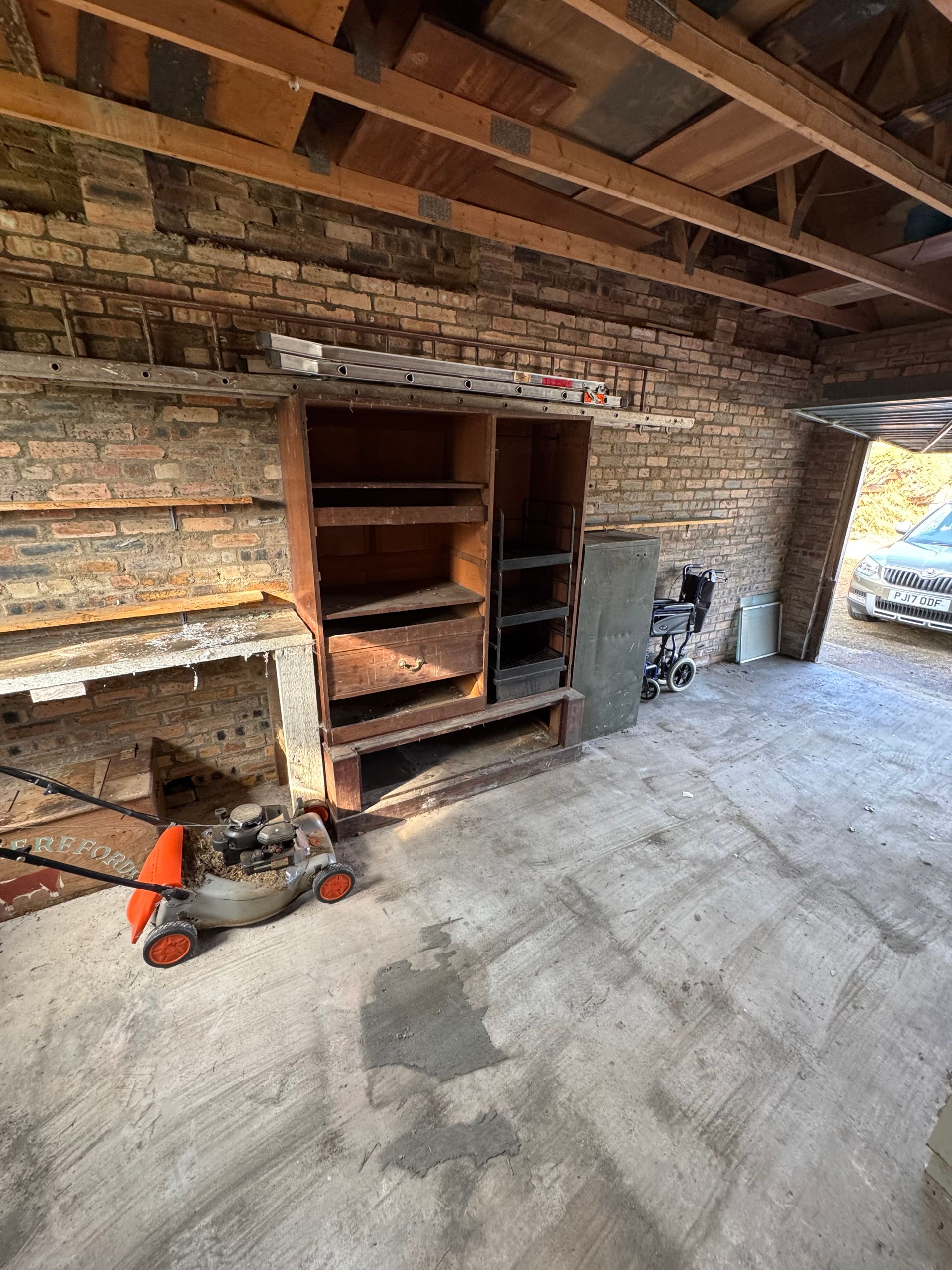 Shelving left for re-use. Lawnmower and chainsaw (in chest), left in situ due to remaining petrol fuel - Unable to dispose of as per T&C's.